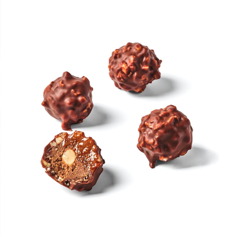 Sugar, cocoa beans, cocoa butter, salted peanut (peeled peanut, vegetable oil, salt), skimmed milk powder, hazelnut, almond, chopped roasted almond, chopped roasted hazelnut, chopped roasted peanut, roasted almond, roasted hazelnut, rice bran oil, concentrated butter (fat 99.8%), sea salt, emulsifier (sunflower lecithin), salt, acidulant (E-330).