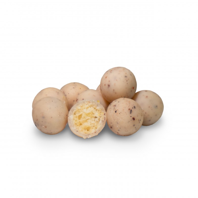 Gragea elaborada con cereal inflado recubierto de chocolate blanco y vainilla. Combina la textura cremosa del exterior con el crujiente del cereal, con notas de vainilla y azúcar caramelizado. Elaborada artesanalmente en nuestro obrador.